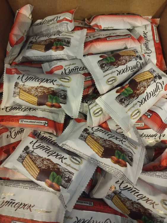 ویفر روسی زیموپوک بادام زمینی با روکش شکلاتی__در وزن‌های ۵۰۰گرمی و یک کیلوگرمی_دارای قیمت عمده برای خریداران عمده.